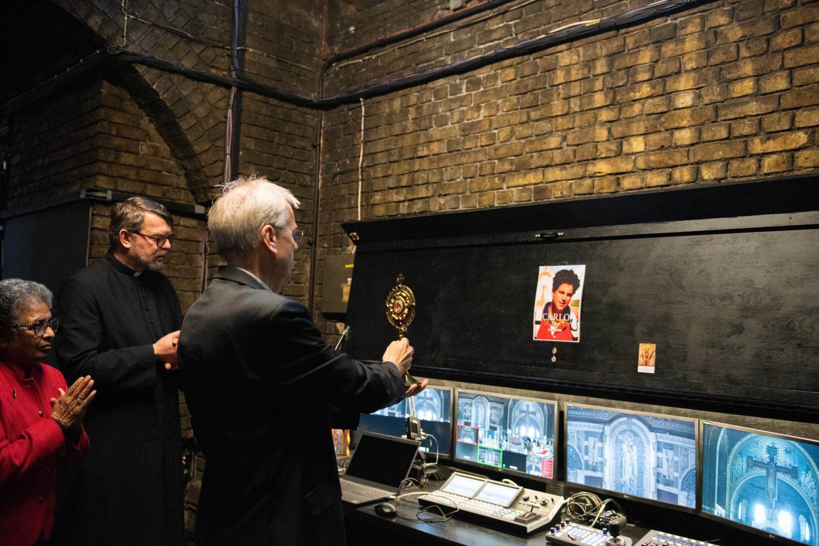 Before the festival began, Bishop Nicholas Hudson blessed the console used to livestream Masses, with the Cathedral’s newly acquired relic of St Carlo Acutis. Volunteers who manage the livestream often seek the young saint’s intercession when technical challenges arise.
